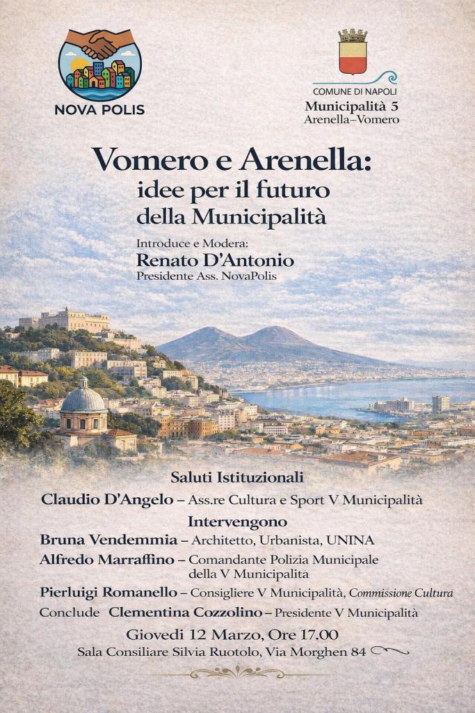 Giovedì 12 marzo, alle ore 17, nella Sala Consiliare “Silvia Ruotolo”, in via Morghen 24, si terrà un interessante convegno dal titolo “Idee per il futuro della Municipalità”. Interverranno la presidente della Municipalità Clementina Cozzolino, l’assessore alla Cultura e allo Sport Claudio D’Angelo, il comandante della Polizia Municipale Alfredo Marrandino, l’architetto Bruno Vendemmia, il consigliere municipale Pierluigi Romanello e il presidente dell’associazione Nova Polis, Renato D’Antonio.